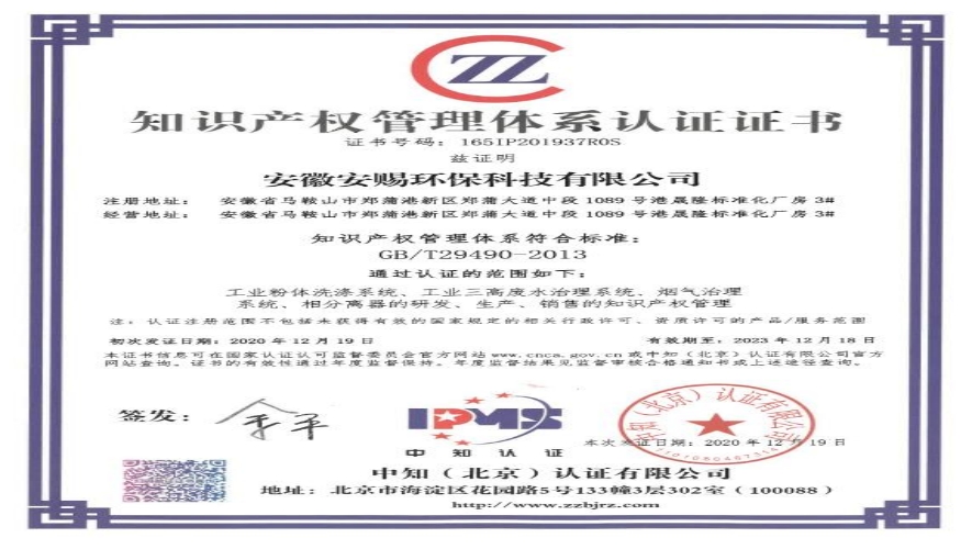2020年12月19日,安徽安赐环保科技有限公司通过知识产权管理体系认证,喜获证书,成为马鞍山郑蒲港新区首家通过知识产权贯标的企业。